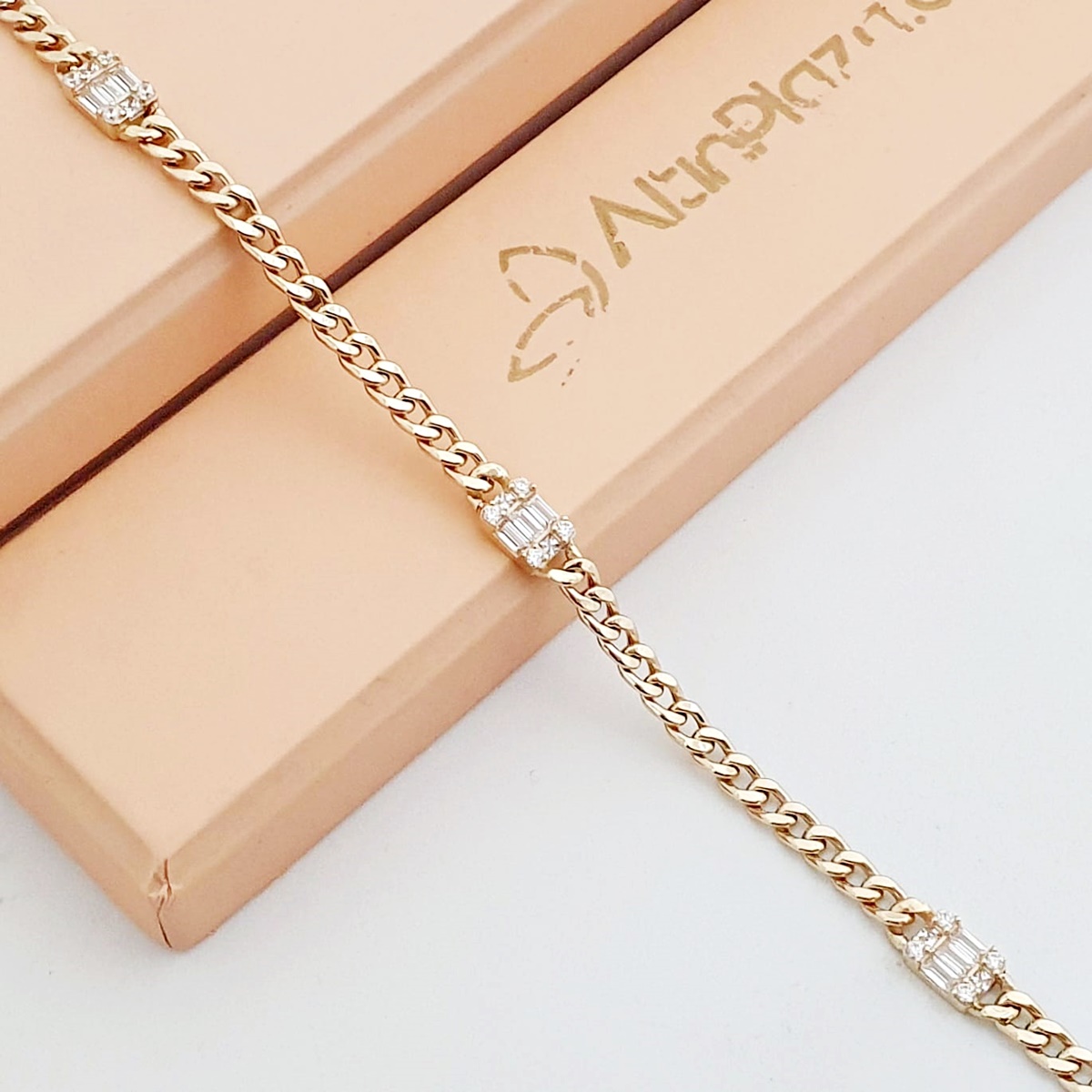 Göz alıcı tasarımı ve zarafetiyle dikkat çeken 14 Ayar 3'lü Baget Gurmet Zincir Bileklik, 14 ayar sarı altından el işçiliğiyle üretilmiştir ve 14 ayar (585k) patent güvencesiyle sunulmaktadır. 5 mm genişliğe ve 19 cm uzunluğa sahip olan bileklik, üzerinde yer alan 3 adet baget taş detayı tasarıma zarif bir ışıltı katarken gurmet zincir yapısıyla modern bir dokunuş sağlar.