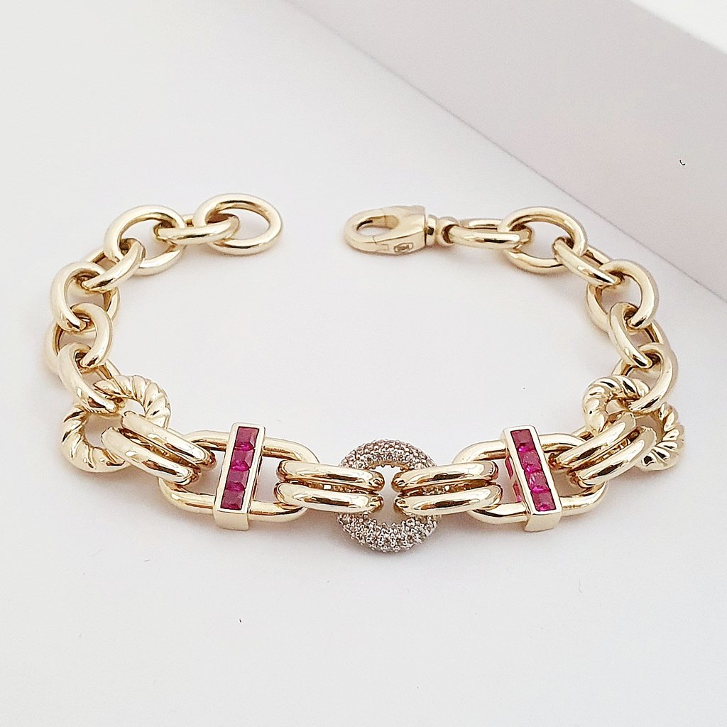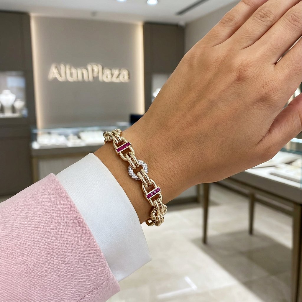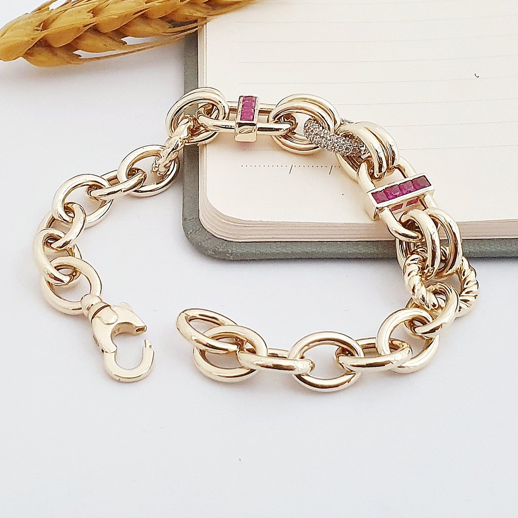 Bileklik, sarı altından üretilmiş dokulu oval halkalar ile beyaz altın üzerine ince taşlarla bezenmiş gösterişli bağlantı noktalarından oluşmaktadır. Işıltısını detaylarında saklayan bu tasarım, güçlü duruşunu incelikle tamamlar. Takı dolabınızın en güncel ve modern parçası olmaya aday olan bu özel tasarım, 14 ayar altından üretilen parlak ve pürüzsüz oval ve çember halkalarıyla bileğinizde eşsiz bir ahenk yakalar.