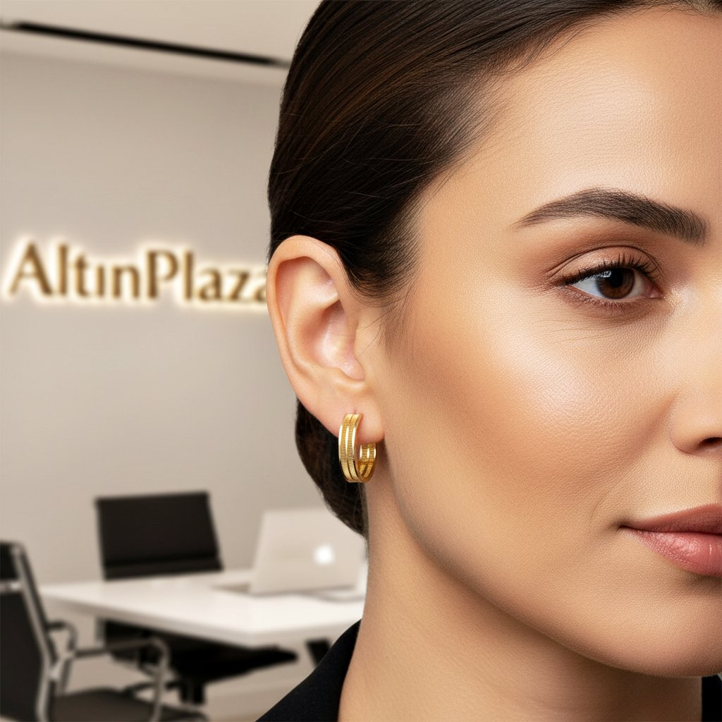 14 Ayar Altın Çizgi Armoni Orta Boy Halka Küpe 20mm KP12422