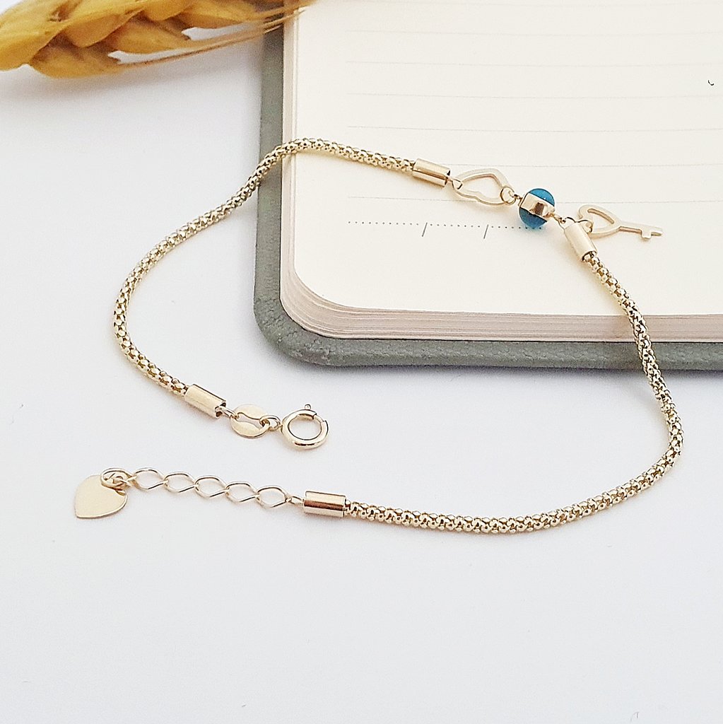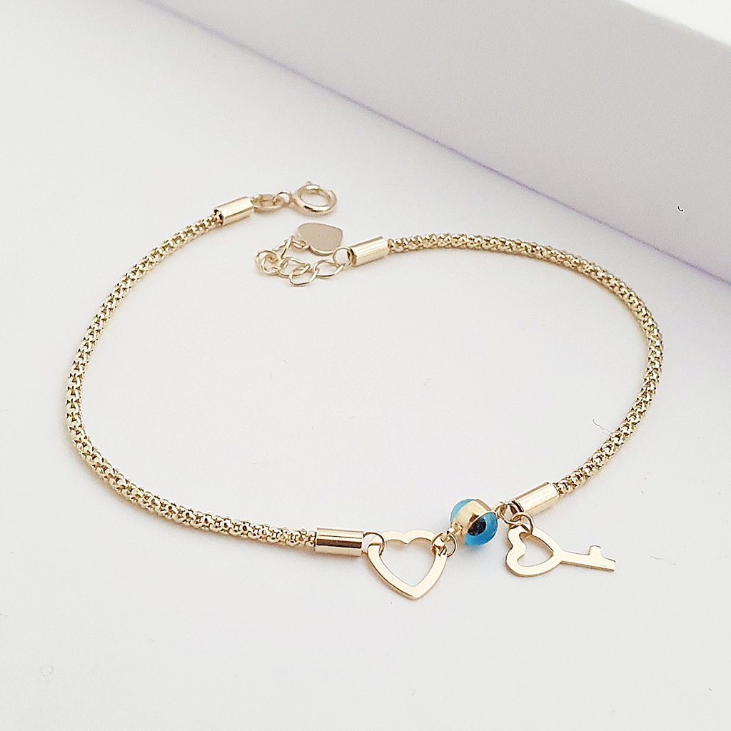 14 Ayar Altın Kalp ve Nazar Detaylı Örgü Zincir Bileklik 708084