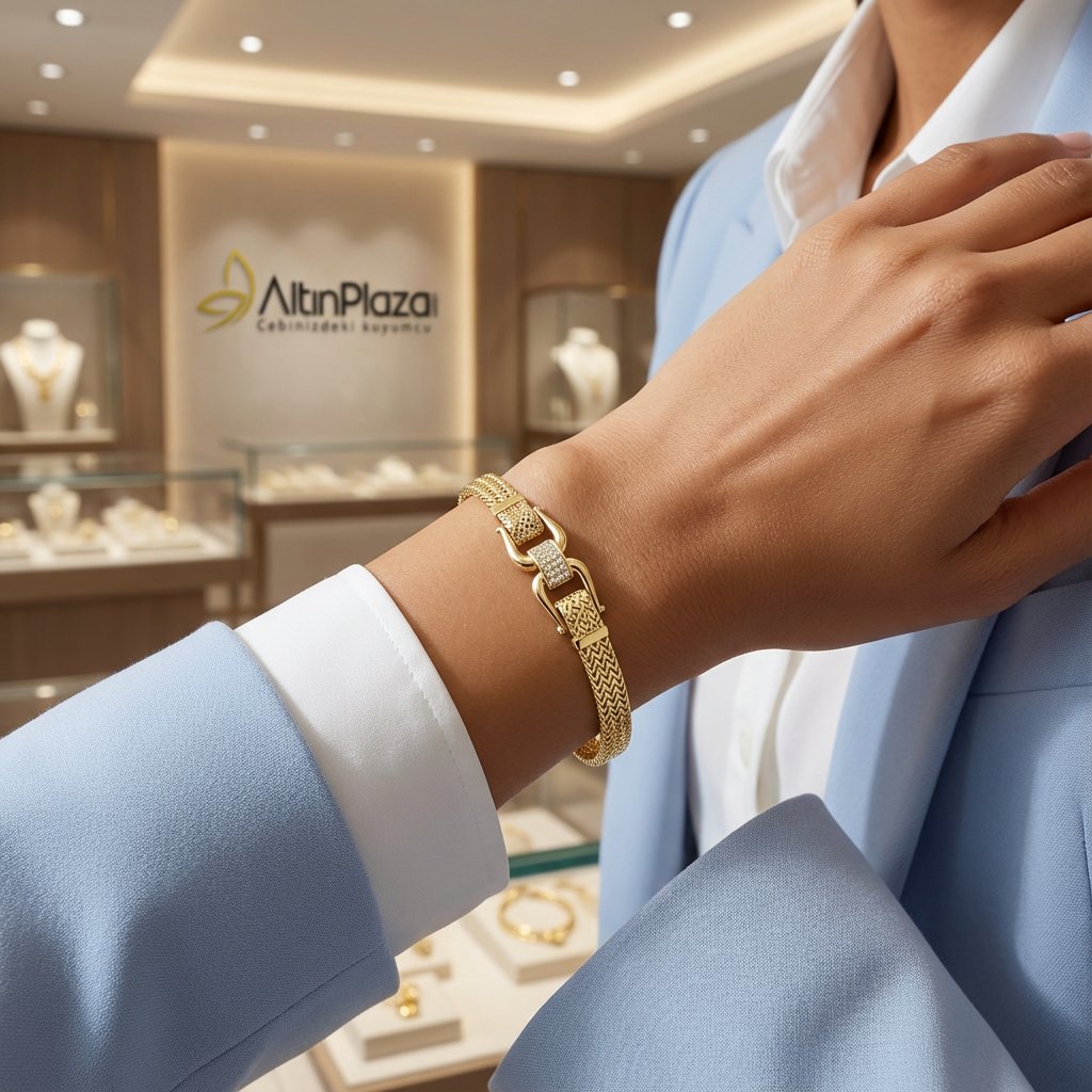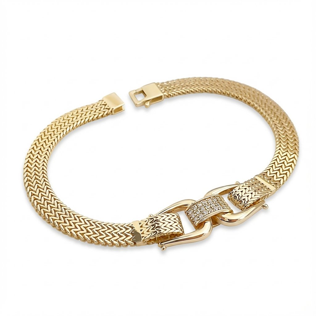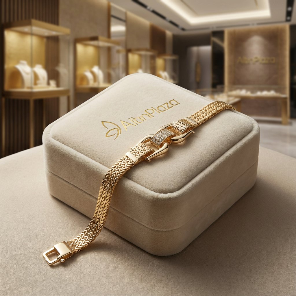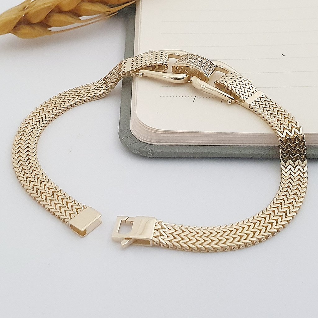 14 Ayar Altın Kemer Detaylı Chevron Örgü Bileklik 788758