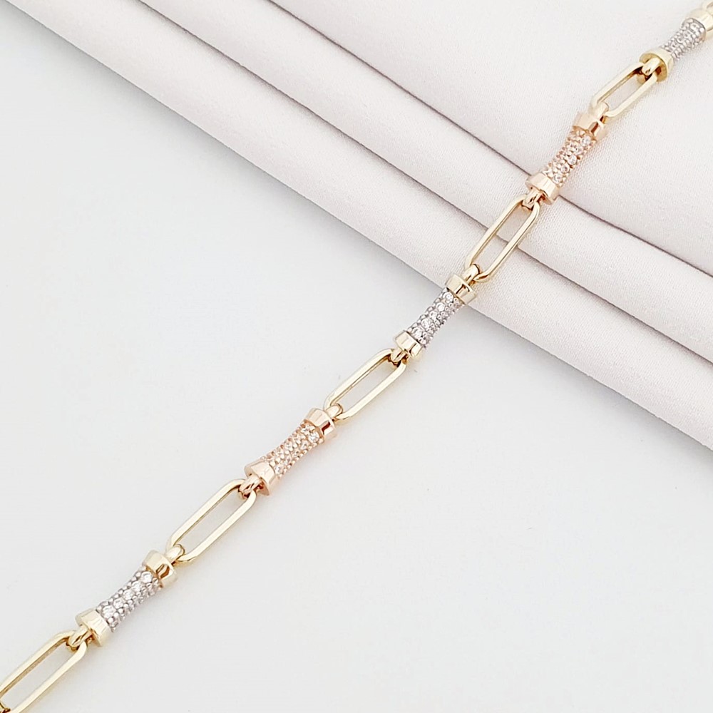 14 ayar altın taşlı fantezi bileklik, parıltılı tasarımı ve ataç zincir detaylarıyla şıklığınıza şıklık katacaktır. Parlak taşları ve ataç zincirin eşsiz uyumu, bu bileklikle birleşerek kombininize uyum sağlar.