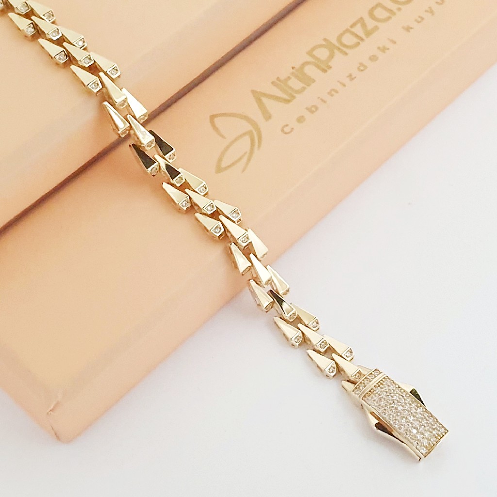 Piramit tasarımlı bu modern 14 ayar bileklik modeli, gösterişli, modern ve fark yaratan stiliyle kadınların vazgeçilmezi olmaya aday. Kilitli taş ışıltılı altın bileklik olarak öne çıkan bu sağlam ürün, 19 cm uzunluğundadır ve size sertifikalı gelir. Altın bileklik modelleri ve fiyatları konusunda güncel ve en uygun seçenekleri sunan AltınPlaza ile taşlı zarafeti yaşayın.
