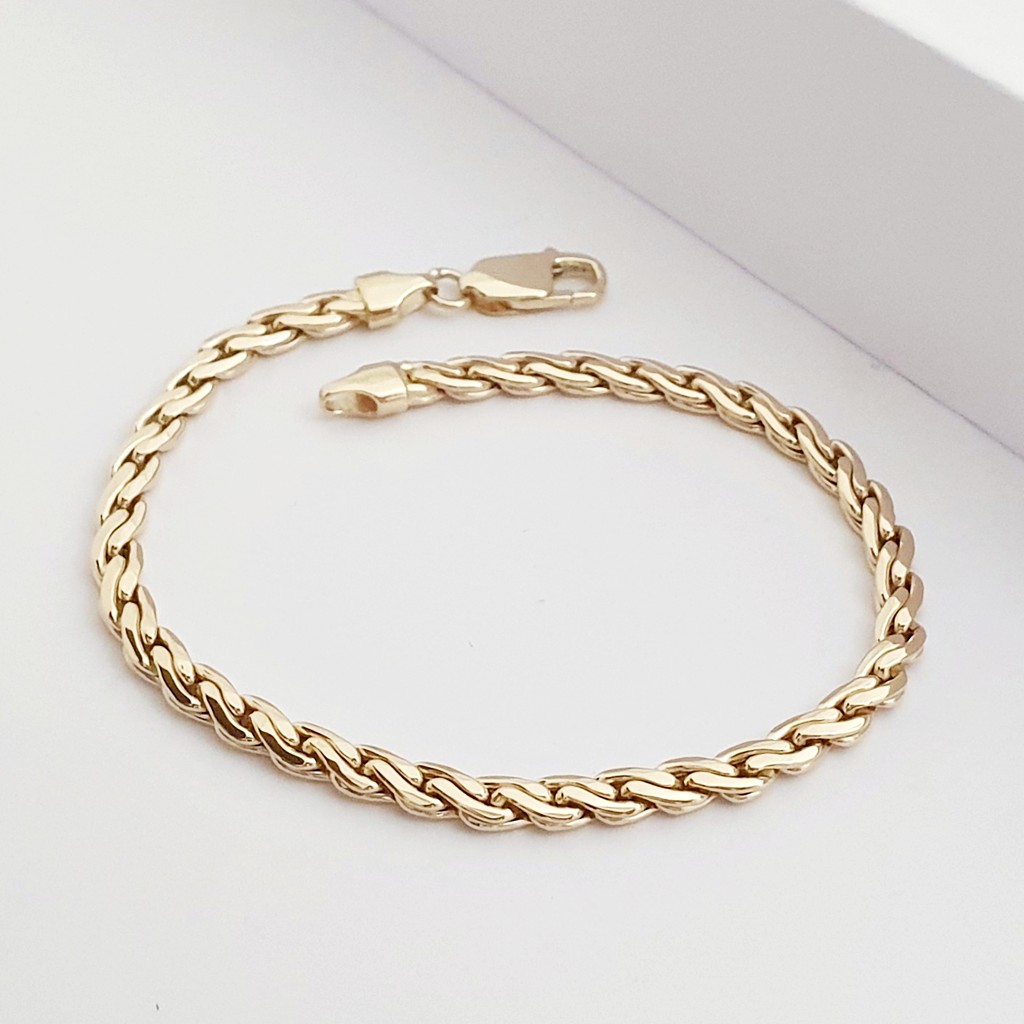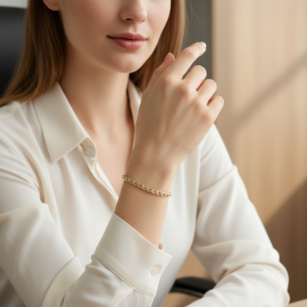 Bileklik, iç içe geçmiş, kıvrımlı halkalardan oluşan (örgülü burma zincir tipinde) parlak yüzeyli ve tok duruşlu bir zincir modelidir. Klipsi standart yaylı kilit sistemidir. En trend ve sportif ürünleri kaliteli tasarımlarıyla Cebinizdeki Kuyumcu AltınPlaza'da bulabilirsiniz. Sportif tasarımıyla ışıltınızı büyüler ve hem gündelik hem de şık kombinlerinizin vazgeçilmezi olur.