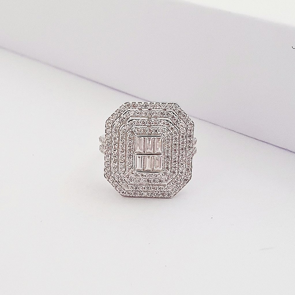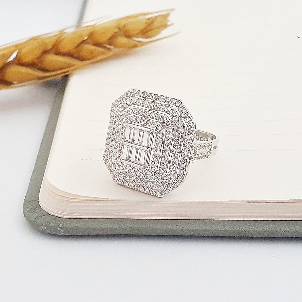 14 Ayar Beyaz Altın Dört Sıra Köşeli Baget Yüzük TK05067