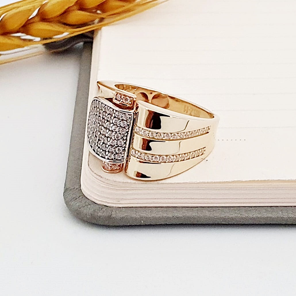 14 ayar sarı, beyaz ve rose altından özenle üretilmiş olup 14 ayar(585k) patenti ile güvenilirliği garanti altına alınmıştır. Bu yüzük, taşlı yapısı ve üç renk altının muhteşem uyumuyla dikkat çeker. Göz alıcı büyüklüğü ve benzersiz tasarımıyla tüm bakışları üzerine çeker.