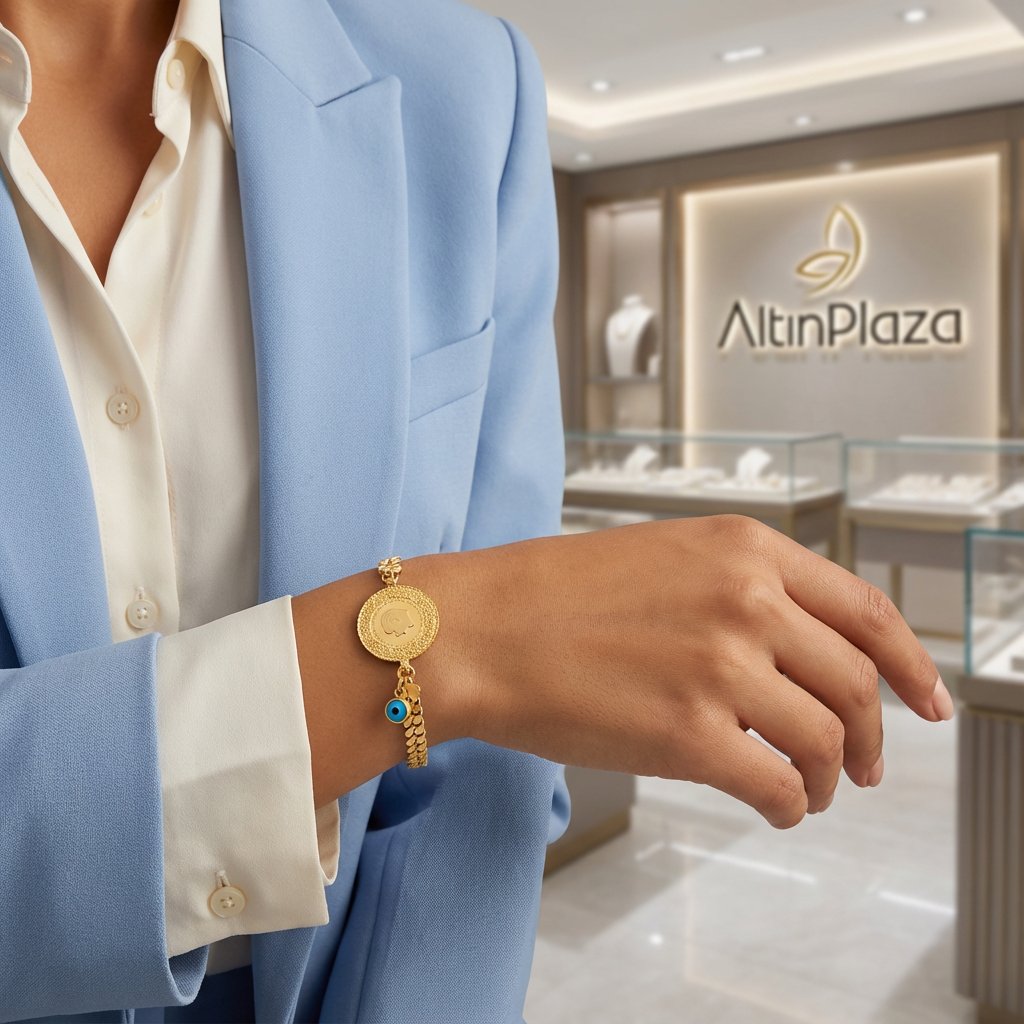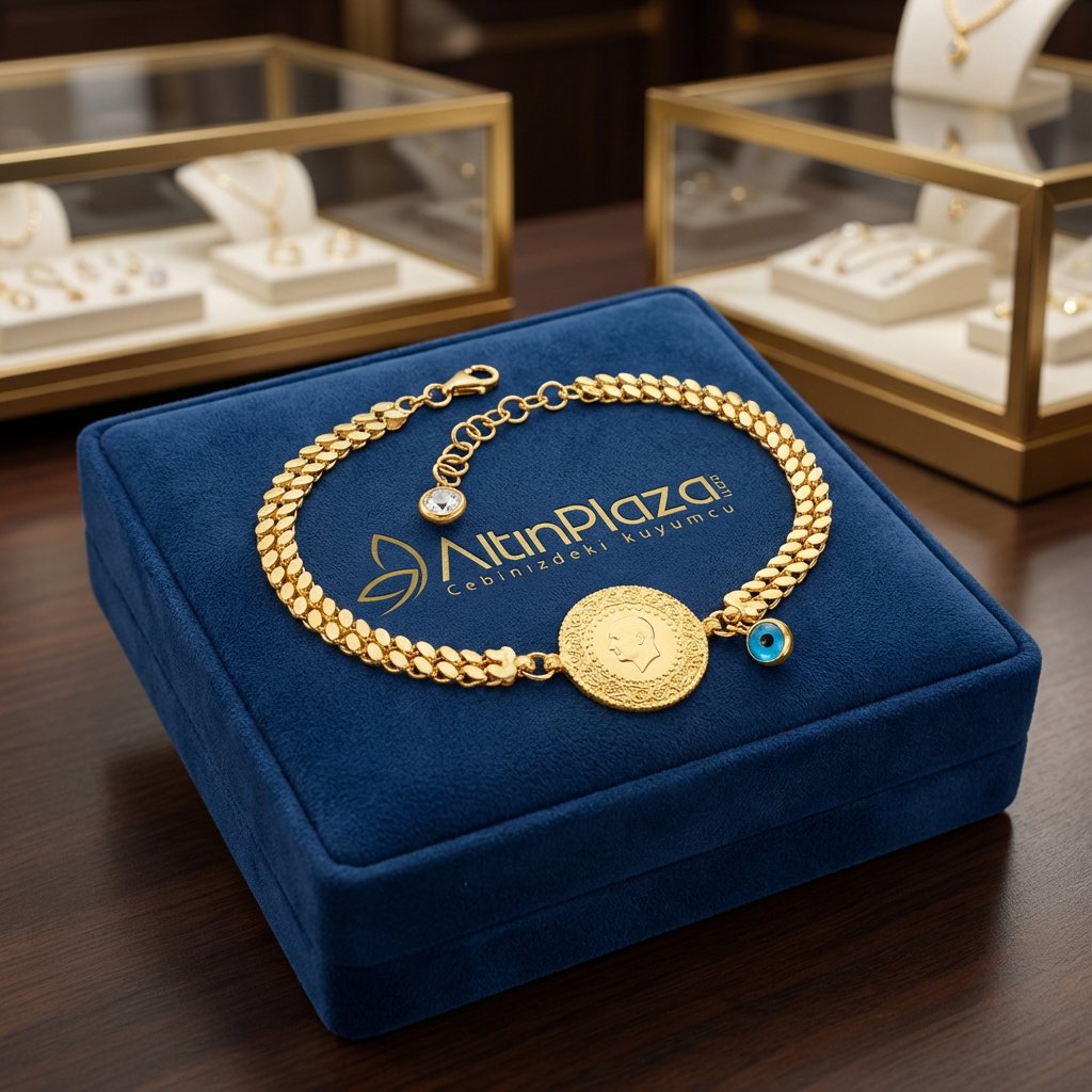22 ayar çeyrek altın ve 14 ayar çift pullu zincir kordonu birleştiren el işçiliği, bilekliğe hem dayanıklılık hem de göz alıcı bir şıklık kazandırır. Çeyrek altının asil parlaklığına, ince detaylarla süslenen nazar boncuğu eşlik etmektedir ve toplam 21 cm uzunluğundaki (17+4 cm ayarlanabilir) bu bileklik, esnek yapısıyla her bileğe kolayca uyum sağlar.
