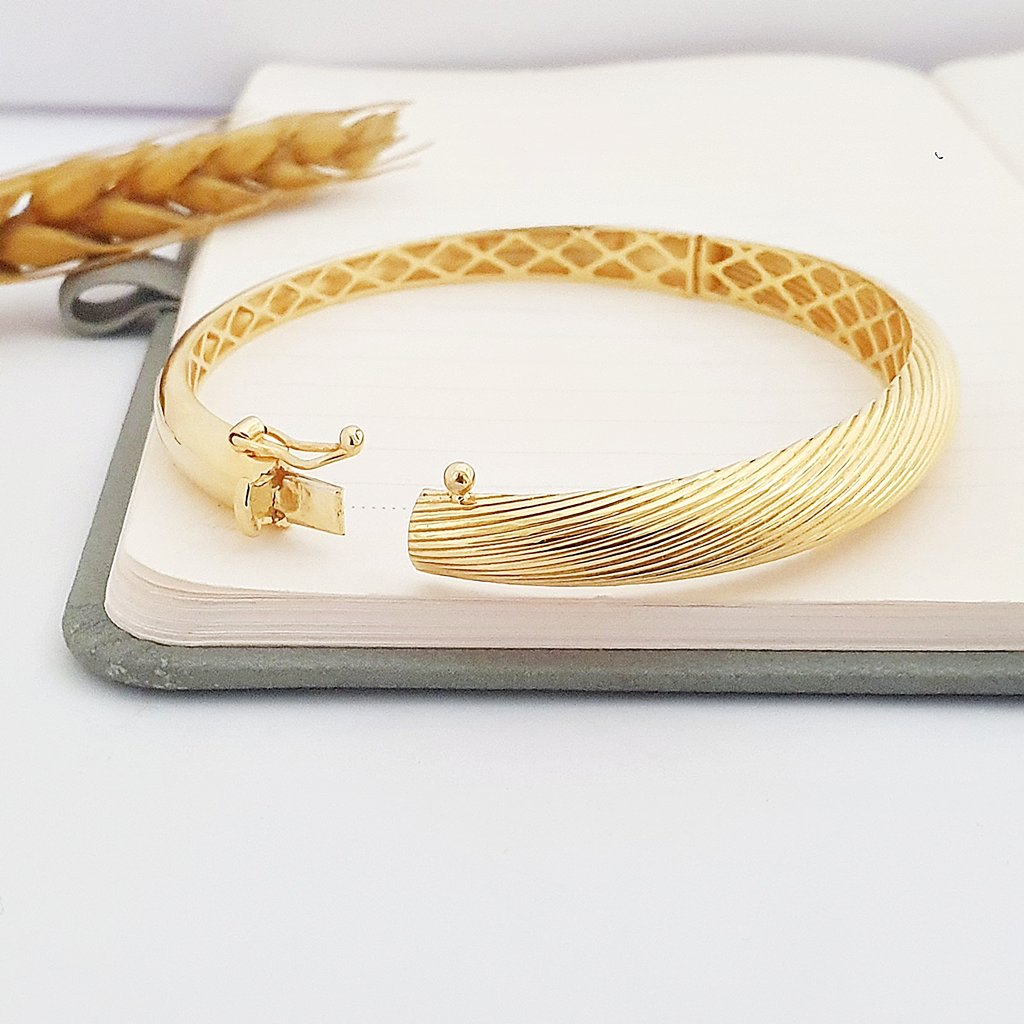 Zarif çizgilerle tasarlanan 22 ayar parça, şıklığı zahmetsizce yakalamanın anahtarı. Bileziğin yüzeyi, sanki bir ressamın fırça darbelerini andıran, birbirine paralel ve hafif eğrisel formda ilerleyen ince kalem işçiliği çizgilerle bezenmiş. Tok duruşu ve pürüzsüz iç yüzeyi ile hem konforu hem de görkemli bir asilliği temsil eden bu kelepçe, geleneksel altın ağırlığını modern bir estetikle harmanlayan gerçek bir ustalık eseri olarak öne çıkıyor.