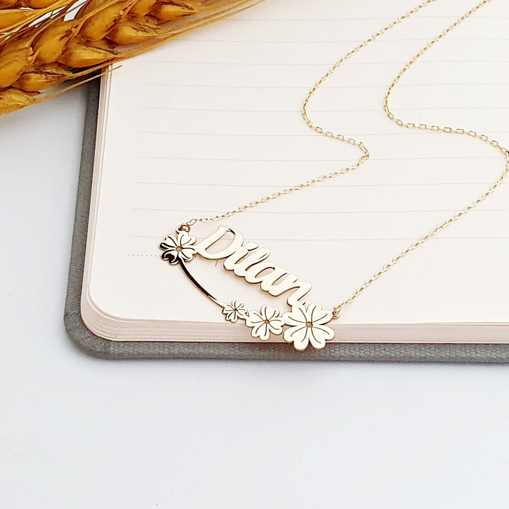 Benim sevdiğim çiçeklerin en güzelidir diyorsanız, çiçek desenli altın isimlik kolye modeli sizi bekliyor.
