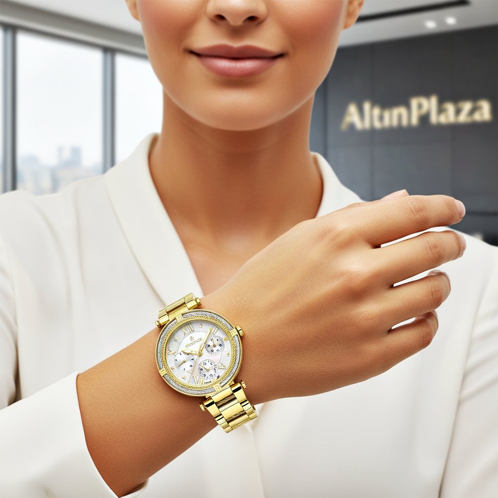 Multifonksiyon (Çok Kadranlı) Mekanizma: Saatiniz sadece zamanı göstermekle kalmaz; üzerindeki üç ayrı alt kadran ile gün, tarih ve 24 saat göstergelerini takip edebilirsiniz. Bu çok kadranlı kadın saat, fonksiyonelliği ön planda tutanlar için idealdir.