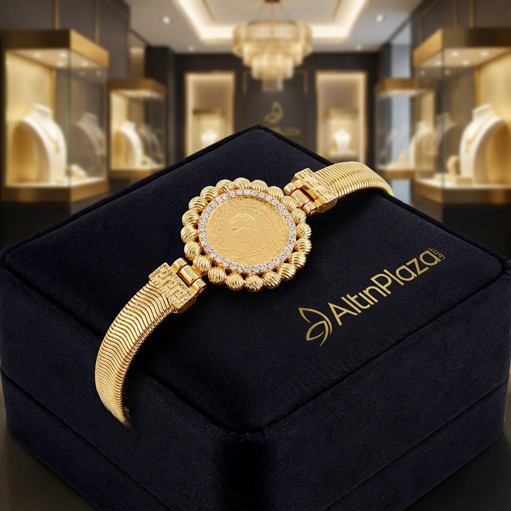 Balık sırtı kordonlu çeyrekli bileklik modeli, 22 ayar çeyrek altın takılı olup çeyrek altın dışındaki parçaları kaliteli bijuteriden üretilmiştir. Kordonu kalın balık sırtı modeliyle dikkat çekerken çerçevesi ise top top tasarımla süslenmiştir.