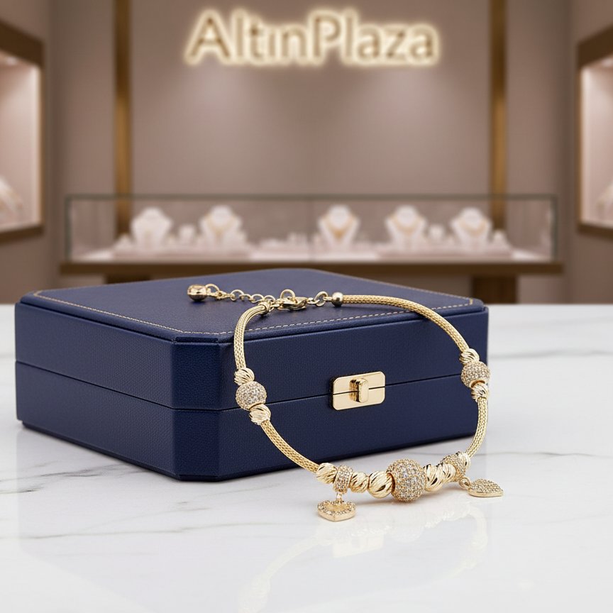 Günlük kullanımdan özel anlara kadar uyum sağlayan bu 8 ayar altın ürün, çok yönlü şıklık sunar. Bilekliğin temelini, bileği hasır bir dokuyla saran, ince işçilikli sarı altın hasır zincir oluşturuyor. Bu özel dokulu zincirin üzerinde, her harekette ışığı farklı açılardan yakalayan dorika topları ve sevginin simgesi olan, ışıltılı yüzeylere sahip kalp charmları asılı duruyor. Işıltılı ve hareketli ürünleri kaliteli tasarımlarıyla Cebinizdeki Kuyumcu AltınPlaza'da bulabilirsiniz.