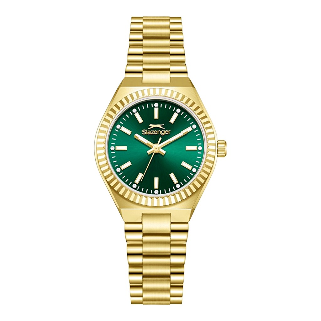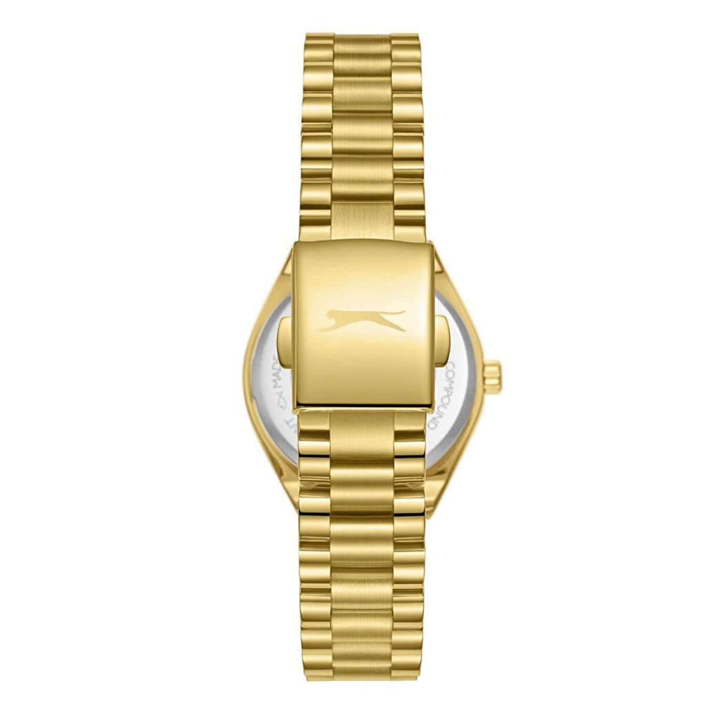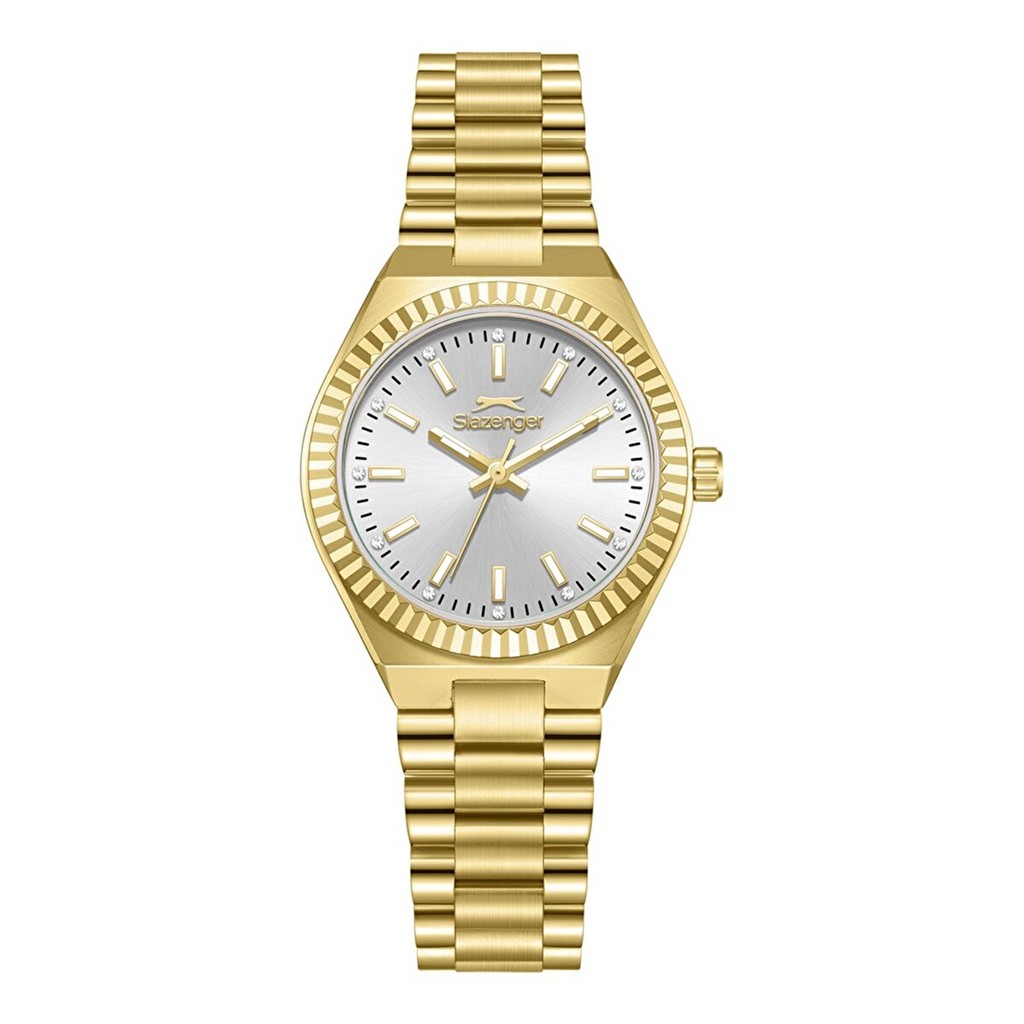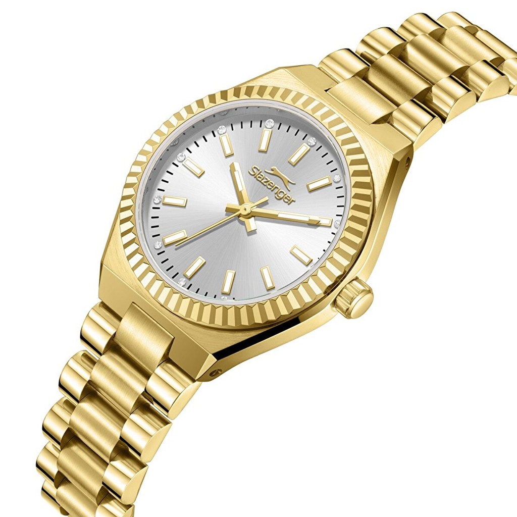 Bu Slazenger saat modeli, hem günlük kullanım hem de özel günler için idealdir. Parlak altın rengi kasası ve bileziği ile dikkat çeker.