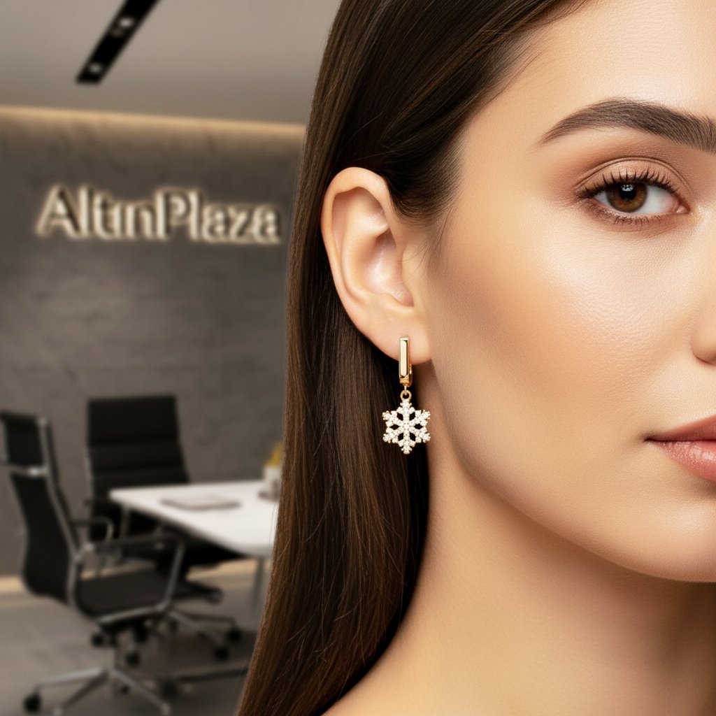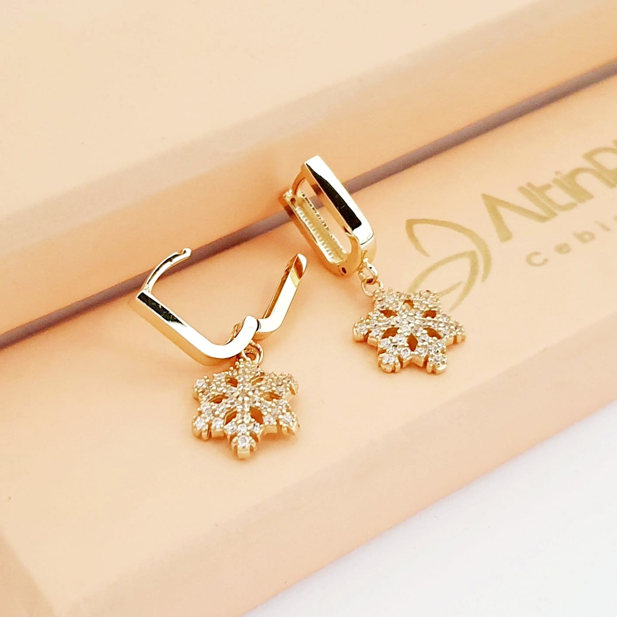 Kış masallarından ilham alan göz alıcı bir ışıltı! Bu altın sallantılı küpe modelleri arasında öne çıkan tasarım, hem modern hem de dikkat çekicidir. Küpenin ana motifi, mikro zirkon taşlarla süslenmiş, detaylı kar tanesi modelidir. Pratik kilitli (halka) yapısı sayesinde kullanımı rahat olan bu altın küpe modeli, özel davetler ve günlük şıklık için ideal bir trend parçadır. Taşlı kar tanesi küpe, kış şıklığınızın vazgeçilmezi olacaktır.