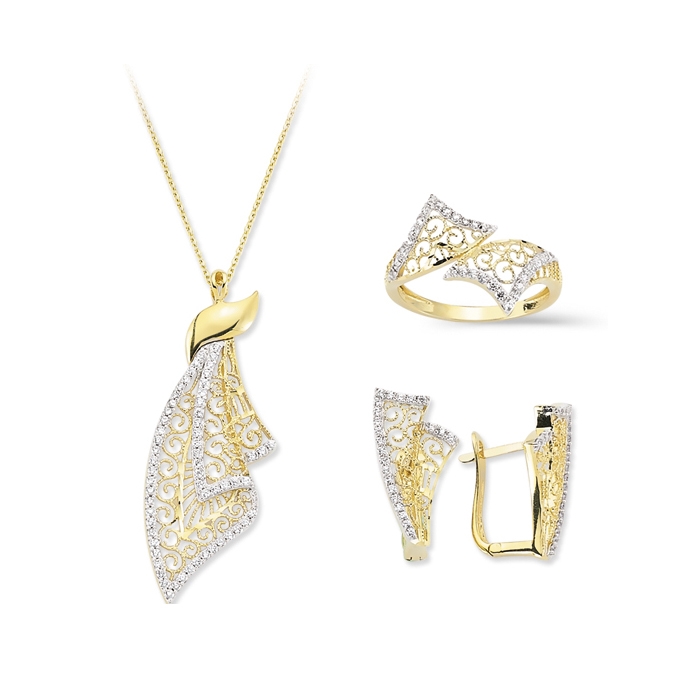 Bu takı seti, 22 ayar sarı altınla işlenmiş muhteşem bir çiçek desenine sahiptir. Zarif, sade ve göz alıcı; kolye, yüzük ve küpeden oluşan 3'lü set takımıdır. Hem günlük kullanıma hem de özel etkinliklere mükemmel uyum sağlar. Her anınıza zarafet katar.