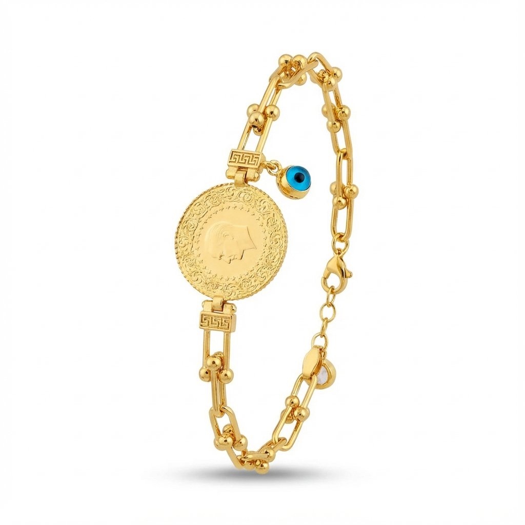 Altın işçiliğinin zarif bir örneği olan Toplu Ataç Zincir 22 Ayar Çeyrekli Bileklik, 14 ayar ve 22 ayar sarı altının muhteşem birleşimini sunar. Bilekliğin en dikkat çeken özelliği, merkezde yer alan 22 ayar çeyrek altının şıklığı, etrafındaki grek desen işlemeleri ve toplu ataç zincir kordonuyla mükemmel bir uyum sağlamasıdır. 17+3 cm ayarlanabilir uzunluğuyla, her bilek ölçüsüne uygun olan bu bileklik, aynı zamanda nazar boncuğu sallantılı detayına sahiptir.