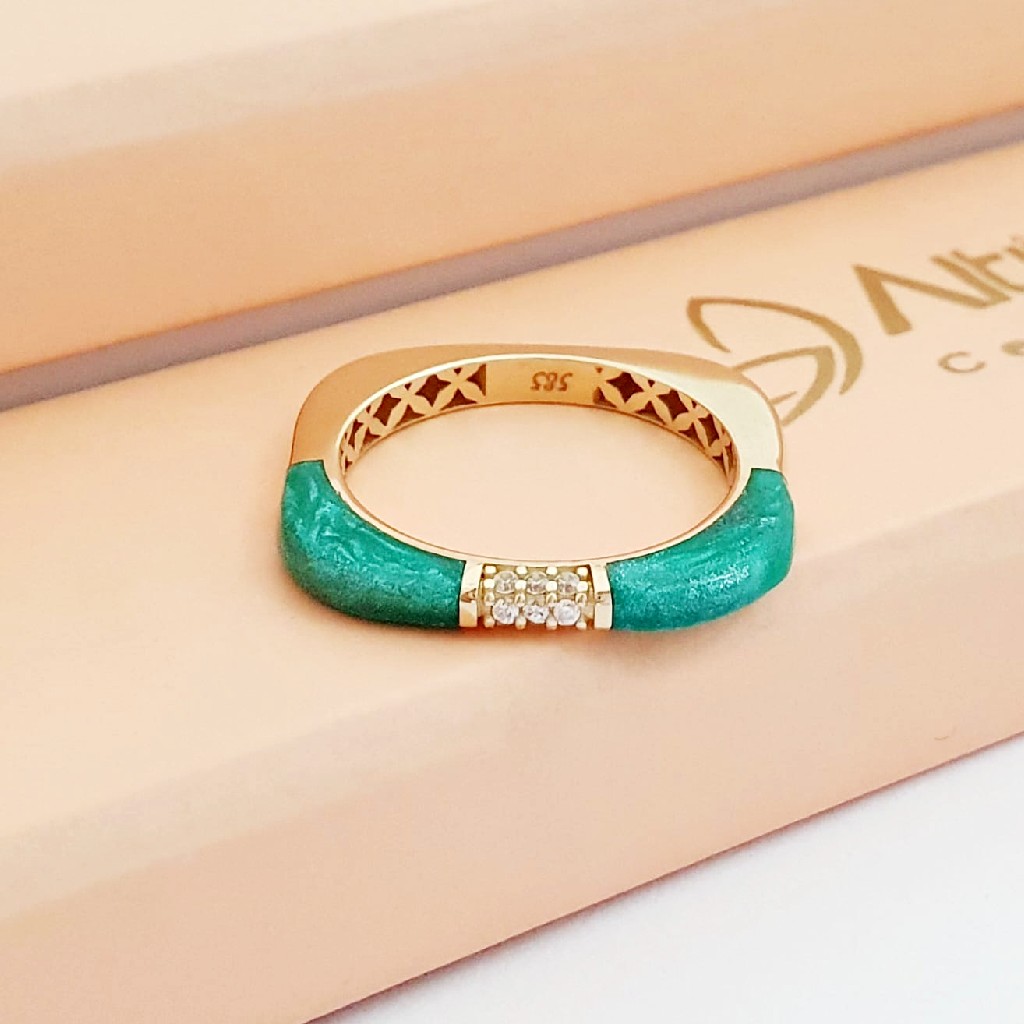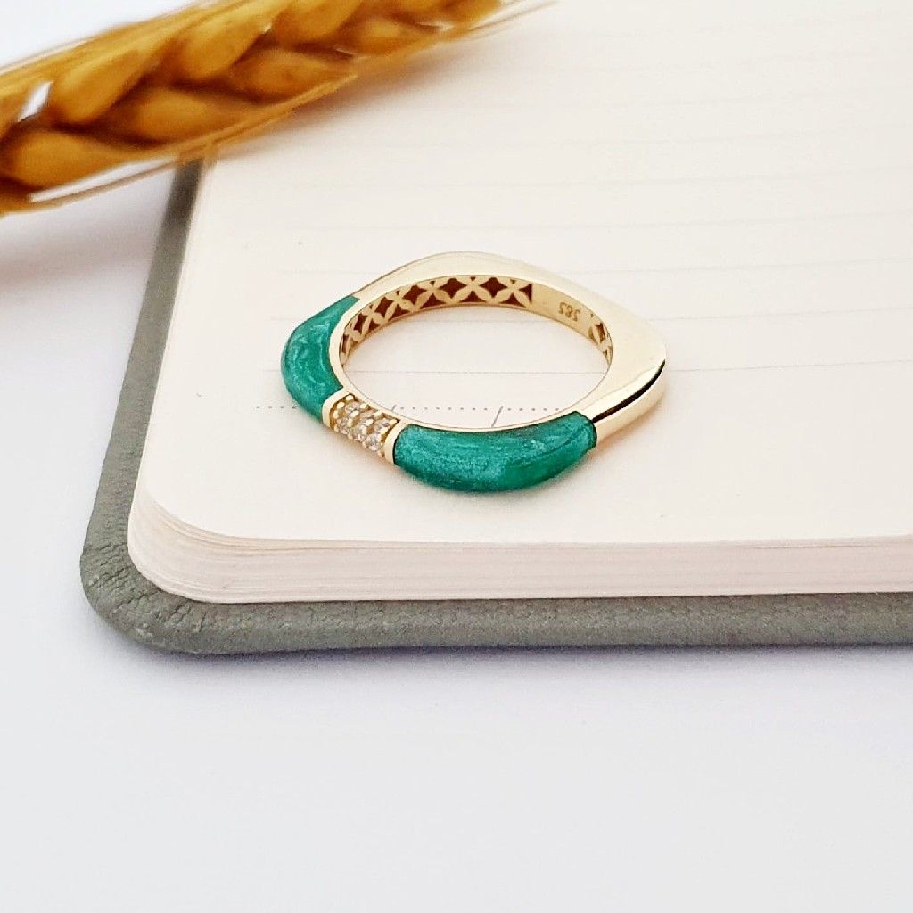 Canlı renklerle buluşan modern ve minimal şıklık! Bu yeşil mineli altın yüzük, altın minimal yüzük modelleri arasında renkli ve trend bir alternatif sunar. Kare forma sahip bu minimal modern yüzük, bir kısmındaki göz alıcı yeşil mine detayı ile farklılık yaratır. Orta kısmında yer alan zarif taş detayları mevcuttur, bu da onu taşlı altın yüzük arayan kadınların vazgeçilmezi 14 ayar yüzük modeli yapar.