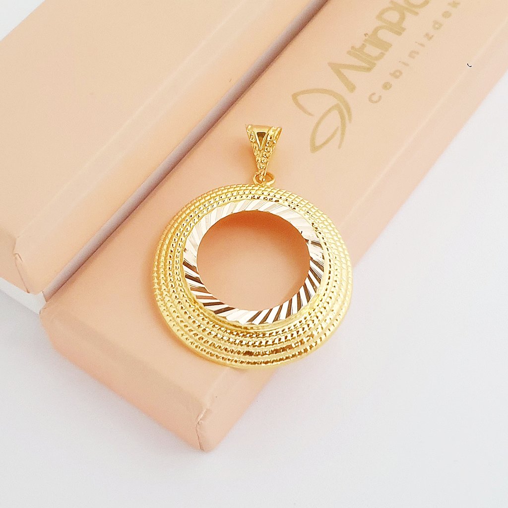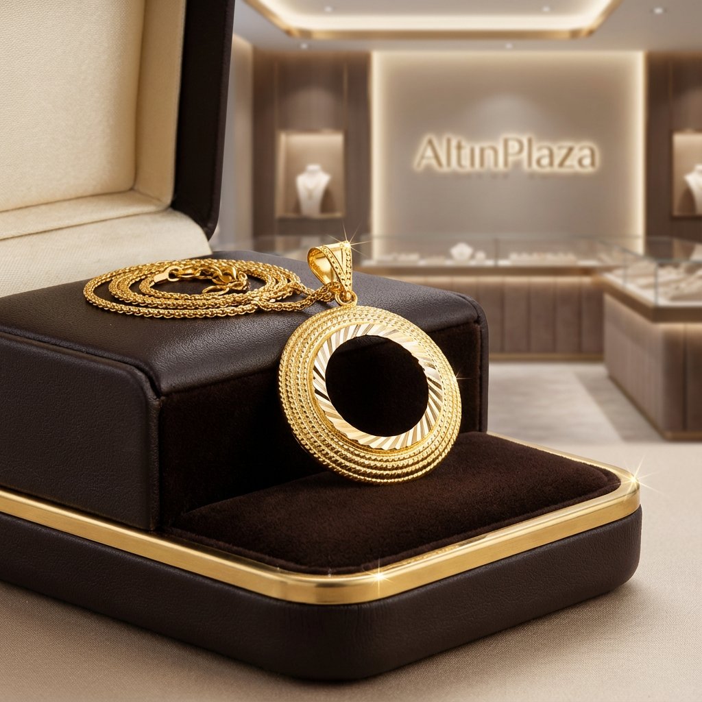 Detaylarıyla fark yaratan bu tasarım, güçlü ama zarif kadınların tercihi. Fark yaratan ürünleri kaliteli tasarımlarıyla Cebinizdeki Kuyumcu AltınPlaza'da bulabilirsiniz. Bu özel çerçeve modeli, yüksek standartlarda 14 ayar altından üretilen yarım altının takılabildiği zarif bir tasarımdır. Bu ürün bir kolye ucudur ve modeli dokuludur, dövme işlemelidir, bu da ona benzersiz bir derinlik ve ışıltılı tasarım katar.